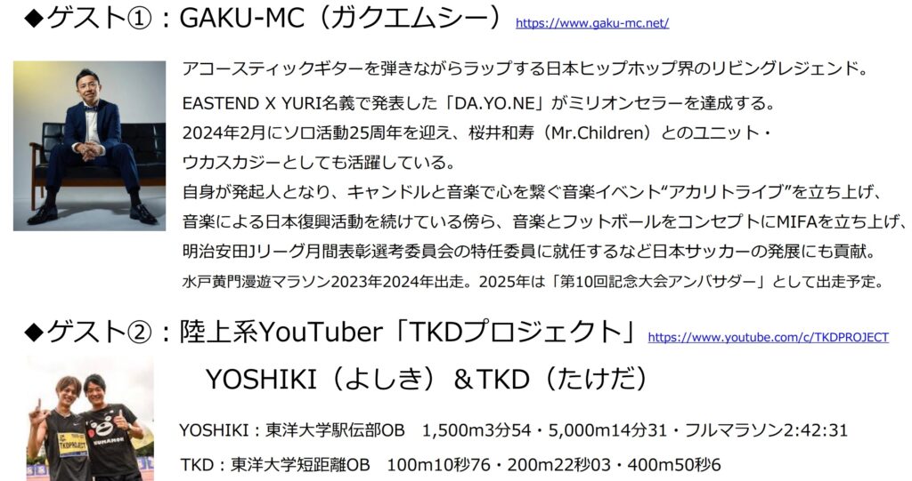 GAKU-MCさんと陸上系YouTuber「TKDプロジェクト」のYOSHIKIさん&TKDさんが,「ランニングとは」・「水戸黄門漫遊マラソンの魅力」についてトークします。