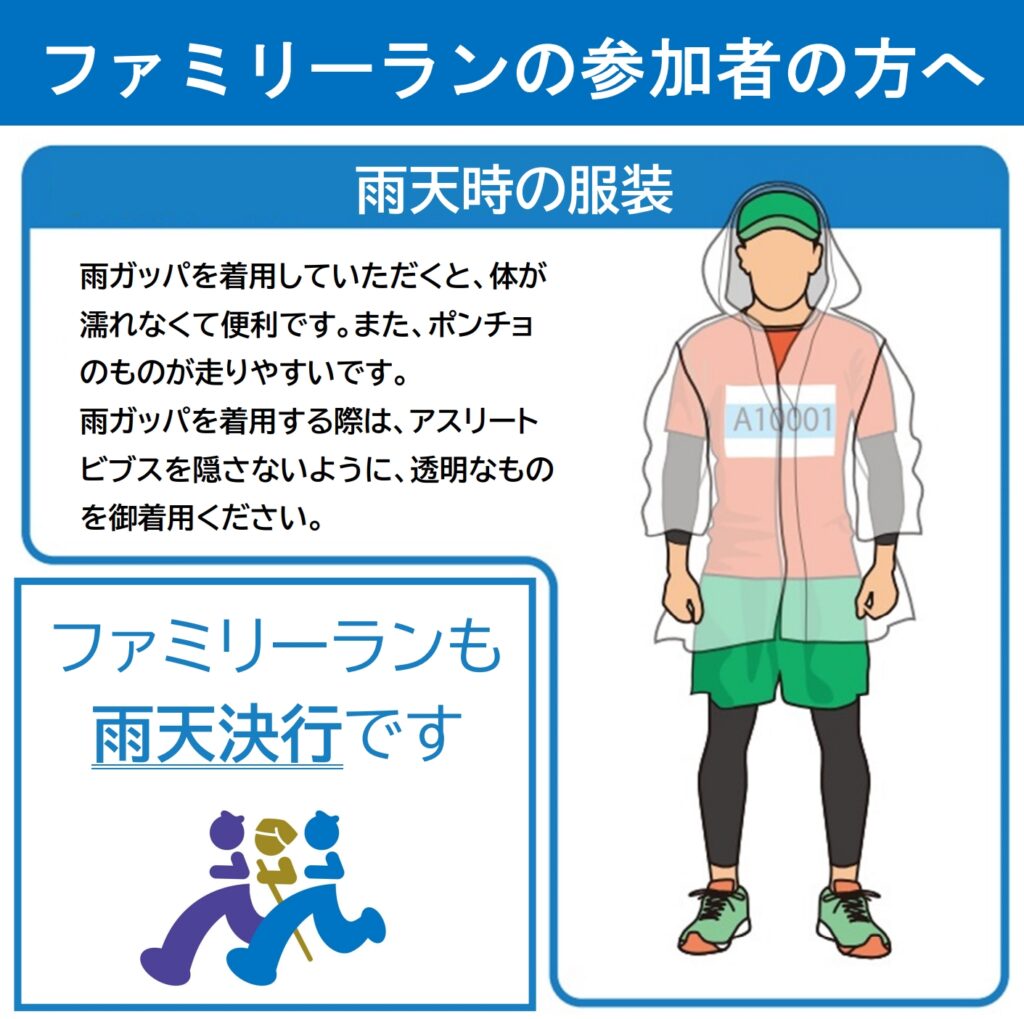 NEWS 2025.10.24 ファミリーランの雨天対策について(お願い) NEW! 大会当日が雨天の場合でも,ファミリーランを開催しますので,各自で雨天・防寒対策をお願いします。 雨ガッパを着用していただくと,体が濡れなくて便利です。また,ポンチョのものが走りやすいです。 ポンチョを着て走る際は,アスリートビブス(ゼッケン)が周囲から見えるように,透明な物を着用していただきますよう,お願いいたします。