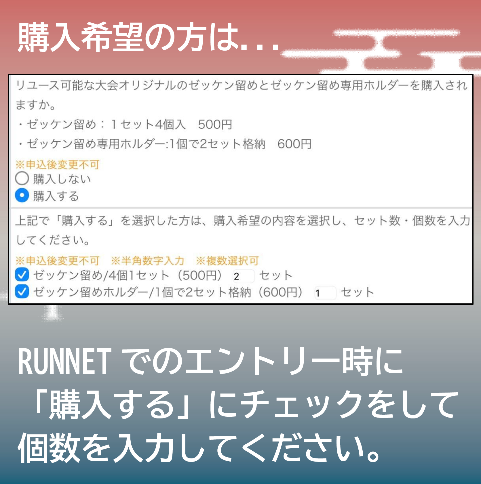 RUNNETでのエントリー時に,グッズ購入の有無を選択する欄がありますので,どちらか選択をお願いします。購入いただいた方には,事前送付物(10月中旬までに発送予定)に同封してお送りします。
